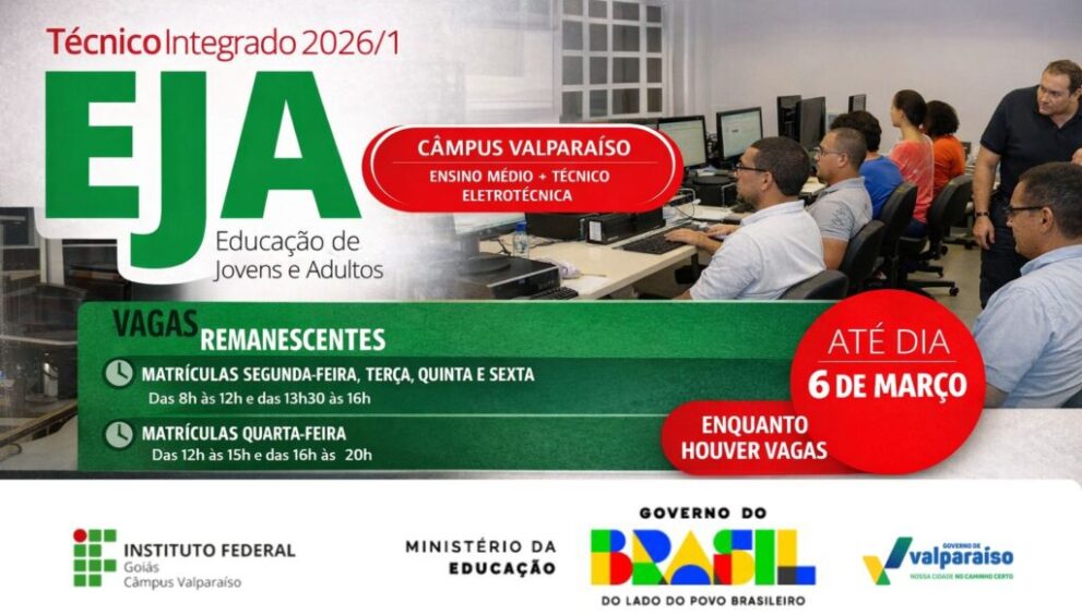 Se você tem 18 anos ou mais e ainda não concluiu o Ensino Médio, esta é a oportunidade de dar um novo passo na sua trajetória educacional e profissional. O Instituto Federal de Goiás – Câmpus Valparaíso está com matrículas abertas, de 19 de fevereiro a 6 de março, para o curso técnico integrado em Eletrotécnica na modalidade Educação de Jovens e Adultos (EJA).
