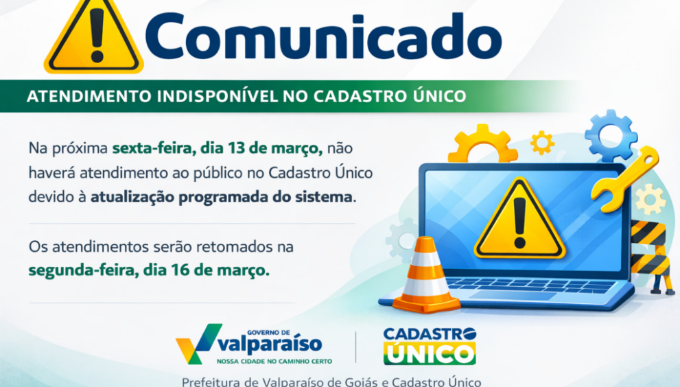 O Cadastro Único informa que, nesta sexta-feira, dia 13 de março, não haverá atendimento ao público na unidade, em razão de atualização programada do sistema. A medida é necessária para garantir a melhoria contínua dos serviços prestados à população.